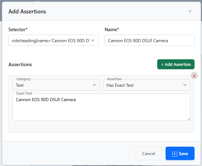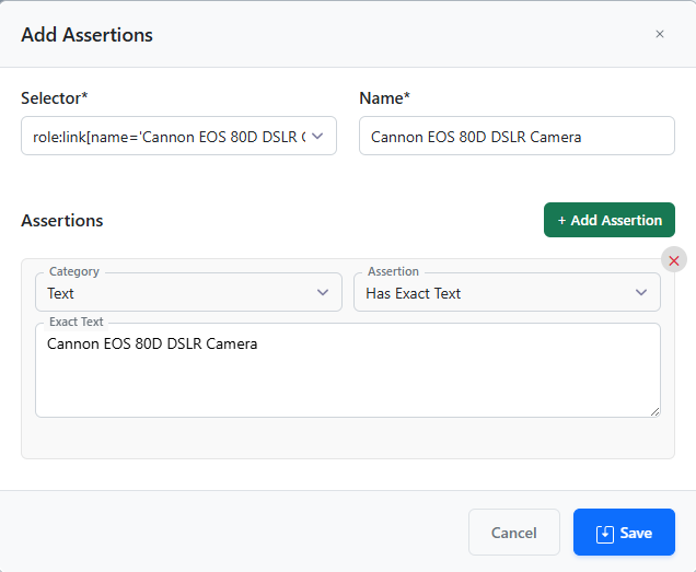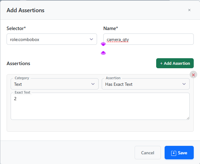 - Visibility Assert: Confirms that an element is visible on the page (e.g., verifying that a confirmation message appears after clicking the